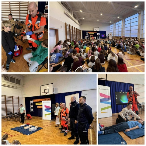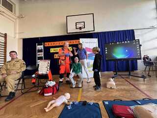 W dniu 22 października 2025 roku w murach naszej szkoły odbyło się wyjątkowe spotkanie w ramach programu „Mali Ratownicy z Powiatu Dąbrowskiego”. W wydarzeniu uczestniczyli uczniowie klas I–VI wraz z wychowawcami, a także zaproszeni goście reprezentujący służby mundurowe i ratunkowe: mł. asp. Filip Srebro oraz mł. asp. Dariusz Leżoń z Komendy Powiatowej Policji w Dąbrowie Tarnowskiej, strażak mł. kpt. Bartłomiej Ciepiela z Państwowej Straży Pożarnej, ratownik medyczny Franciszek Sterczek oraz członek Powiatowej Rady Bezpieczeństwa Ruchu Drogowego w Dąbrowie Tarnowskiej – pani Sylwia Ziemian. Celem spotkania było przybliżenie dzieciom zasad bezpieczeństwa, nauka udzielania pierwszej pomocy oraz kształtowanie odpowiedzialnych postaw w codziennym życiu. Każdy z zaproszonych gości opowiedział o swojej pracy oraz przedstawił praktyczne wskazówki dotyczące reagowania w sytuacjach zagrożenia. Spotkanie przebiegło w serdecznej i pełnej entuzjazmu atmosferze. Dzieci aktywnie uczestniczyły w zajęciach, zadawały pytania i chętnie brały udział w pokazach praktycznych. Na zakończenie wszyscy uczestnicy otrzymali odblaskowe elementy, a przedstawiciele służb zostali nagrodzeni gromkimi brawami. Podsumowując, spotkanie w ramach programu „Mali Ratownicy z Powiatu Dąbrowskiego” było niezwykle wartościowym doświadczeniem edukacyjnym. Uczniowie zdobyli wiedzę o bezpieczeństwie, pierwszej pomocy, zasadach ruchu drogowego, odpowiedzialnym korzystaniu z Internetu oraz bezpiecznej jeździe na hulajnodze. Dzięki takim inicjatywom dzieci uczą się, że każdy – nawet najmłodszy – może zostać małym ratownikiem i pomóc drugiemu człowiekowi w potrzebie.