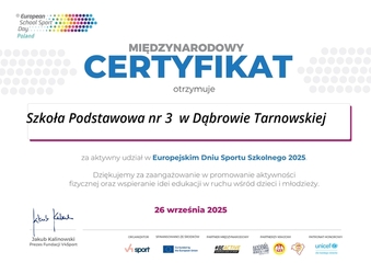 Międzynarodowy certyfikat Europejskiego Dnia Sportu Szkolnego dla szkoły Podstawowej nr 3 w Dąbrowie Tarnowskiej