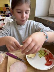 W tym tygodniu uczniowie klasy 3b poznawali zasady zdrowego odżywiania. Podczas zajęć dowiedzieli się, jak ważne jest zrównoważone jedzenie, aktywność fizyczna i wybór wartościowych produktów. W grupach wykonali Piramidę Zdrowego Żywienia, przygotowali kolorowe prace plastyczne pt. „Talerz pełen zdrowia”, a na zakończenie zajęć – samodzielnie przygotowali własne zdrowe kanapki. Zajęcia dostarczyły uczniom wiele radości i inspiracji do zdrowego stylu życia.