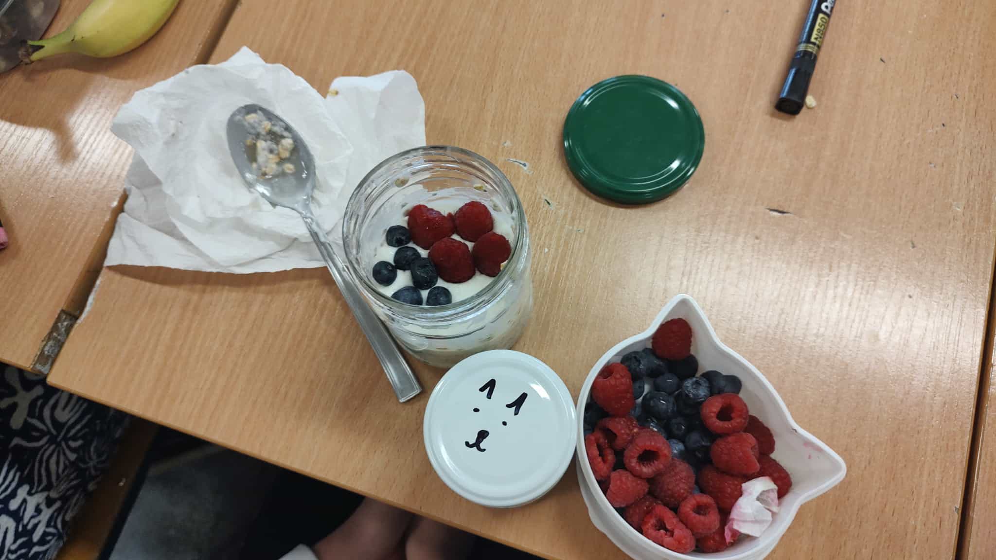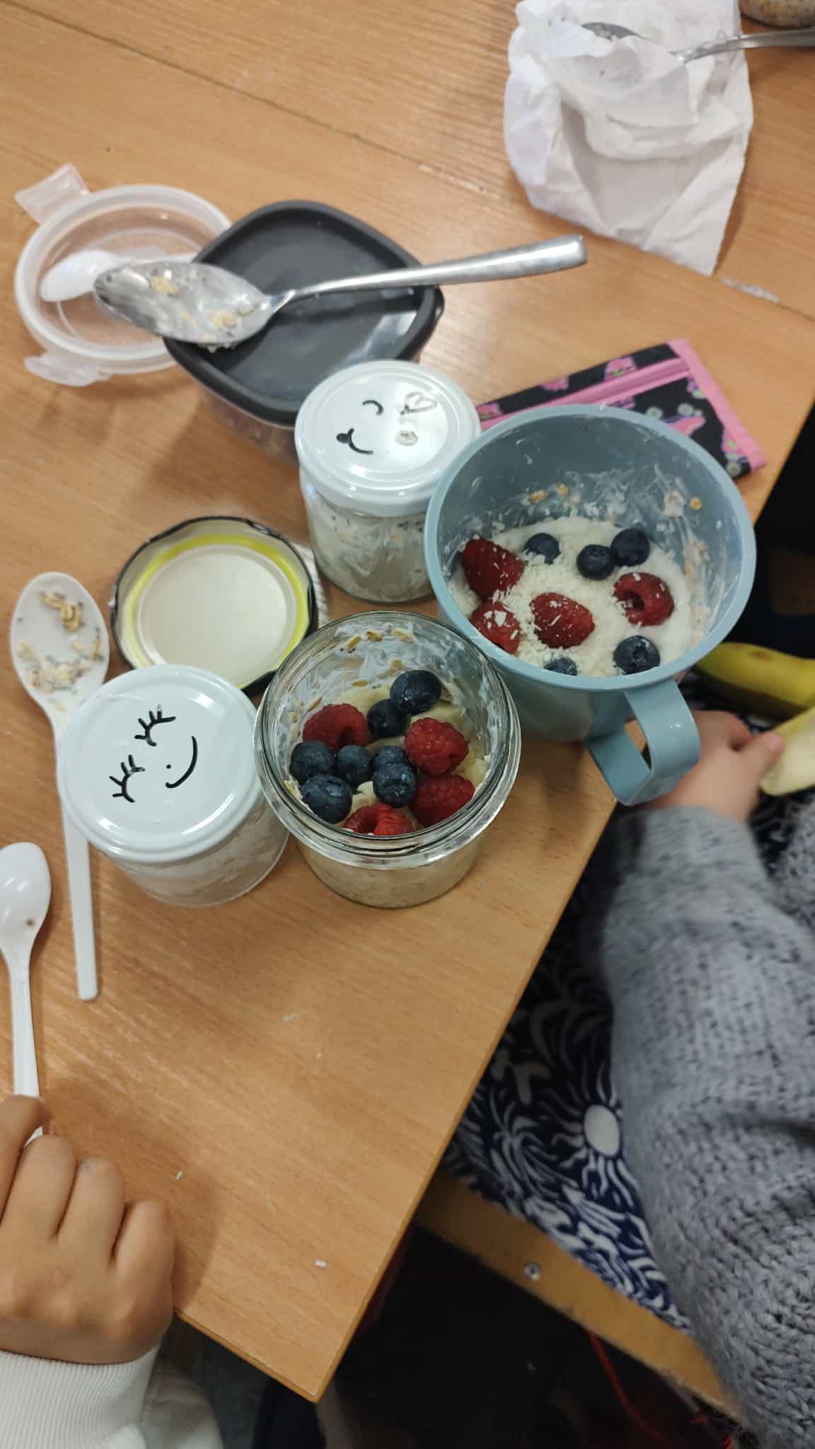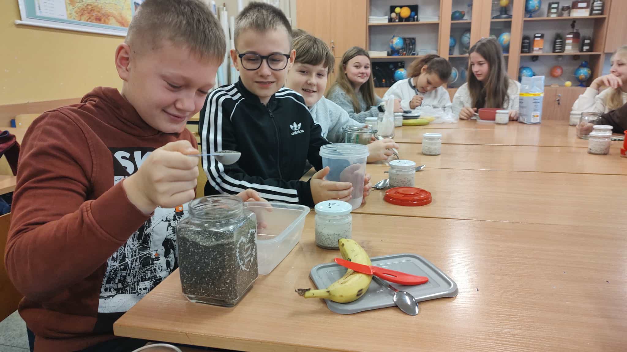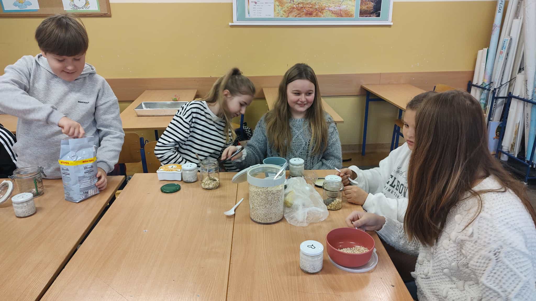 Podczas lekcji uczniowie wspólnie przygotowali zdrową owsiankę, pokazując, że wartościowe śniadanie może być szybkie, smaczne i kolorowe. Każdy mógł dodać swoje ulubione dodatki: owoce, orzechy, jogurt czy miód. Wspólne śniadanie pokazało, że dbanie o zdrowie może być przyjemne i pyszne.