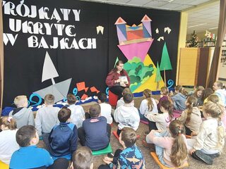 Udział uczniów klas 2b i 3a w zajęciach "Trójkąty ukryte w bajkach" w Bibliotece Publicznej w Dąbrowie Tarnowskiej