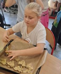 Klasa 2a postanowiła to sprawdzić w ramach projektu „Szkoła promująca zdrowie” i wyruszyła na słodką misję odkrywania tajemnic cukru! Zajęcia rozpoczęły się od ciekawego filmu edukacyjnego, który w przystępny sposób pokazał, jak nadmiar cukru wpływa na nasze ciało i samopoczucie. Potem uczniowie wzięli udział w ożywionej dyskusji — zastanawiali się, czy wszystkie słodycze są niezdrowe, jak wybierać te lepsze, i czym można zastąpić cukier w codziennej diecie. Najwięcej emocji wzbudziło badanie zawartości cukru w różnych produktach. Uczniowie byli zaskoczeni, ile łyżeczek cukru kryje się w napojach, płatkach śniadaniowych czy batonach! Na zakończenie lekcji przyszedł moment, na który wszyscy czekali z niecierpliwością – pieczenie zdrowych owsianych ciasteczek! Okazało się, że można jeść słodko i jednocześnie zdrowo.