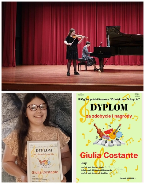 Z przyjemnością dzielimy się wspaniałą wiadomością - Giulia Costante zdobyła I miejsce w III Ogólnopolskim Konkursie „Dźwiękowe Odkrycia”. To wyjątkowe wyróżnienie pokazuje, jak pasja, talent i ciężka praca przynoszą niesamowite efekty. Konkurs odbył się w Poznaniu 8 stycznia 2026 roku i był oceniany przez wybitne jury: