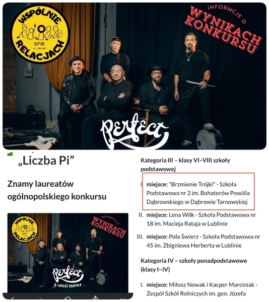 Z dumą informujemy, że biorący udział w Ogólnopolskim Konkursie Muzycznym „Liczba Pi – Wspólnie o relacjach” (Zaśpiewaj Liczbę Pi wspólnie z zespołem Perfect & Łukasz Drapała) zespół muzyczny "Brzmienie Trójki" Szkoła Podstawowa nr 3 im. Bohaterów Powiśla Dąbrowskiego zdobył...
