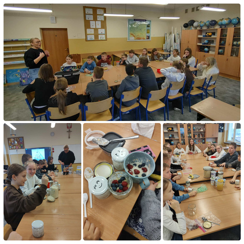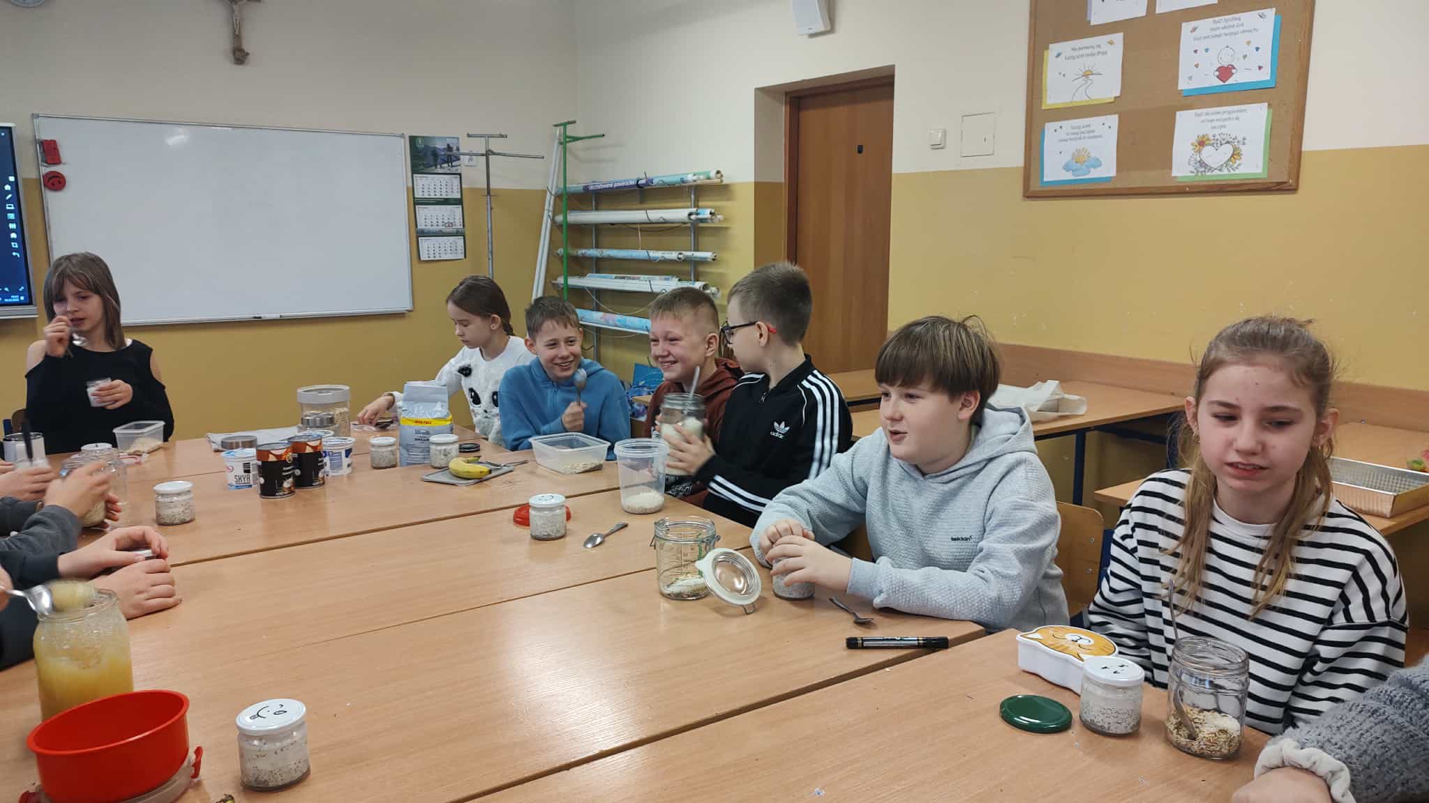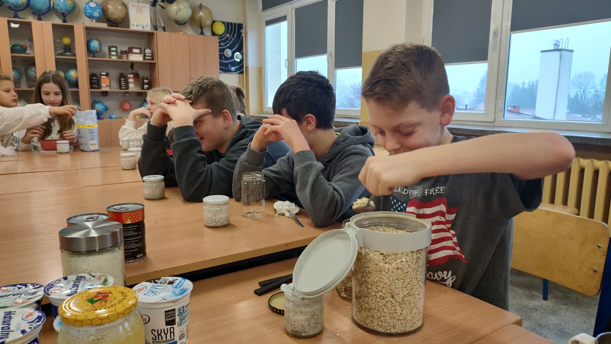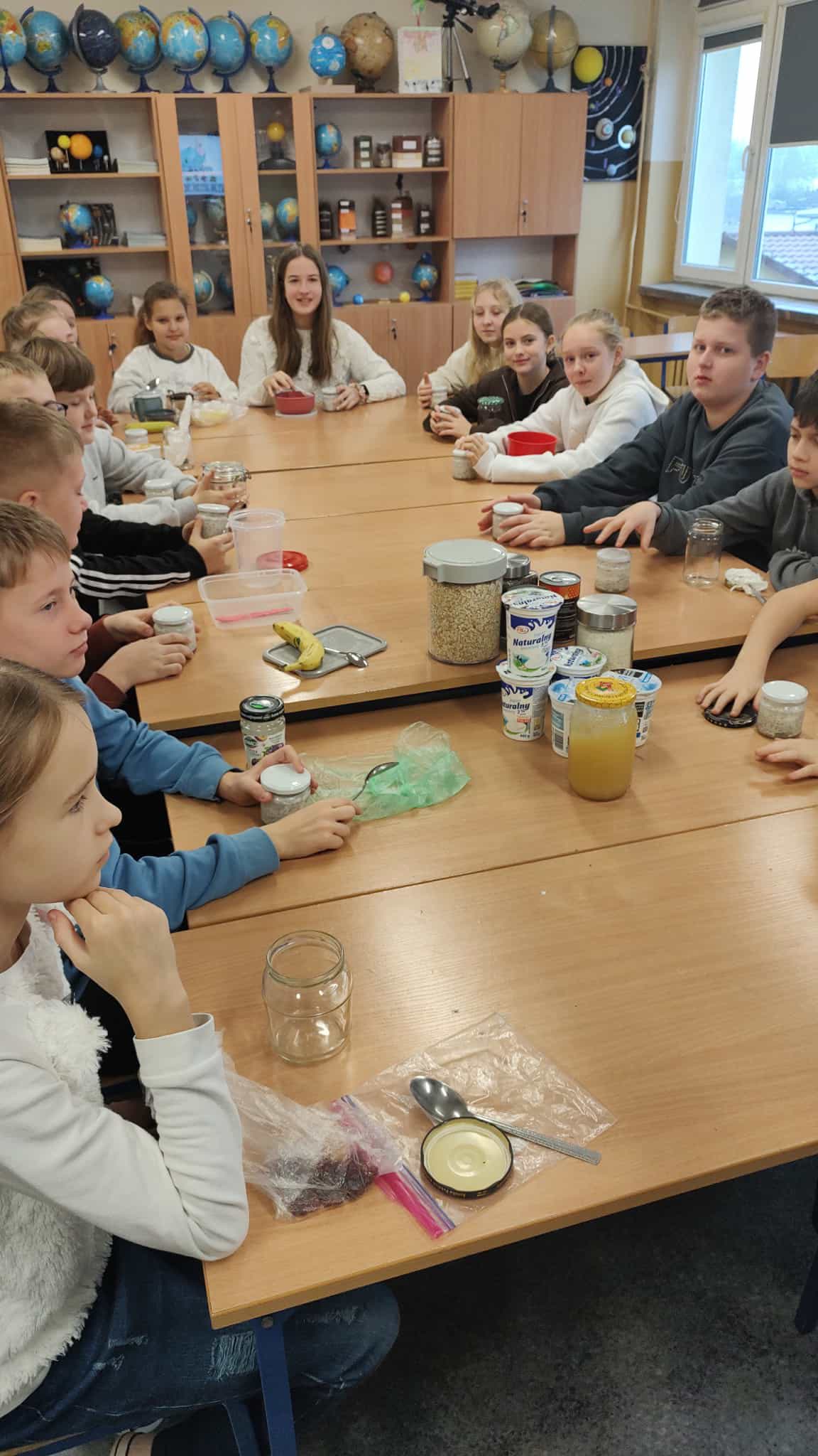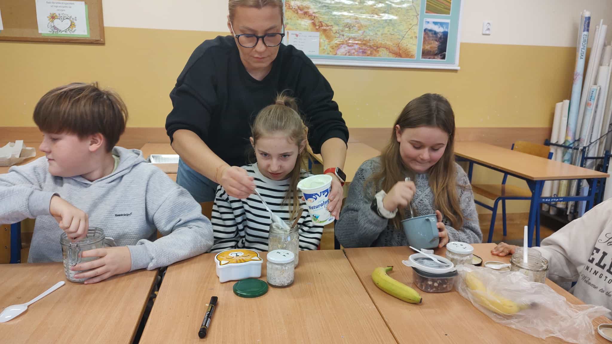 Podczas lekcji uczniowie wspólnie przygotowali zdrową owsiankę, pokazując, że wartościowe śniadanie może być szybkie, smaczne i kolorowe. Każdy mógł dodać swoje ulubione dodatki: owoce, orzechy, jogurt czy miód. Wspólne śniadanie pokazało, że dbanie o zdrowie może być przyjemne i pyszne.