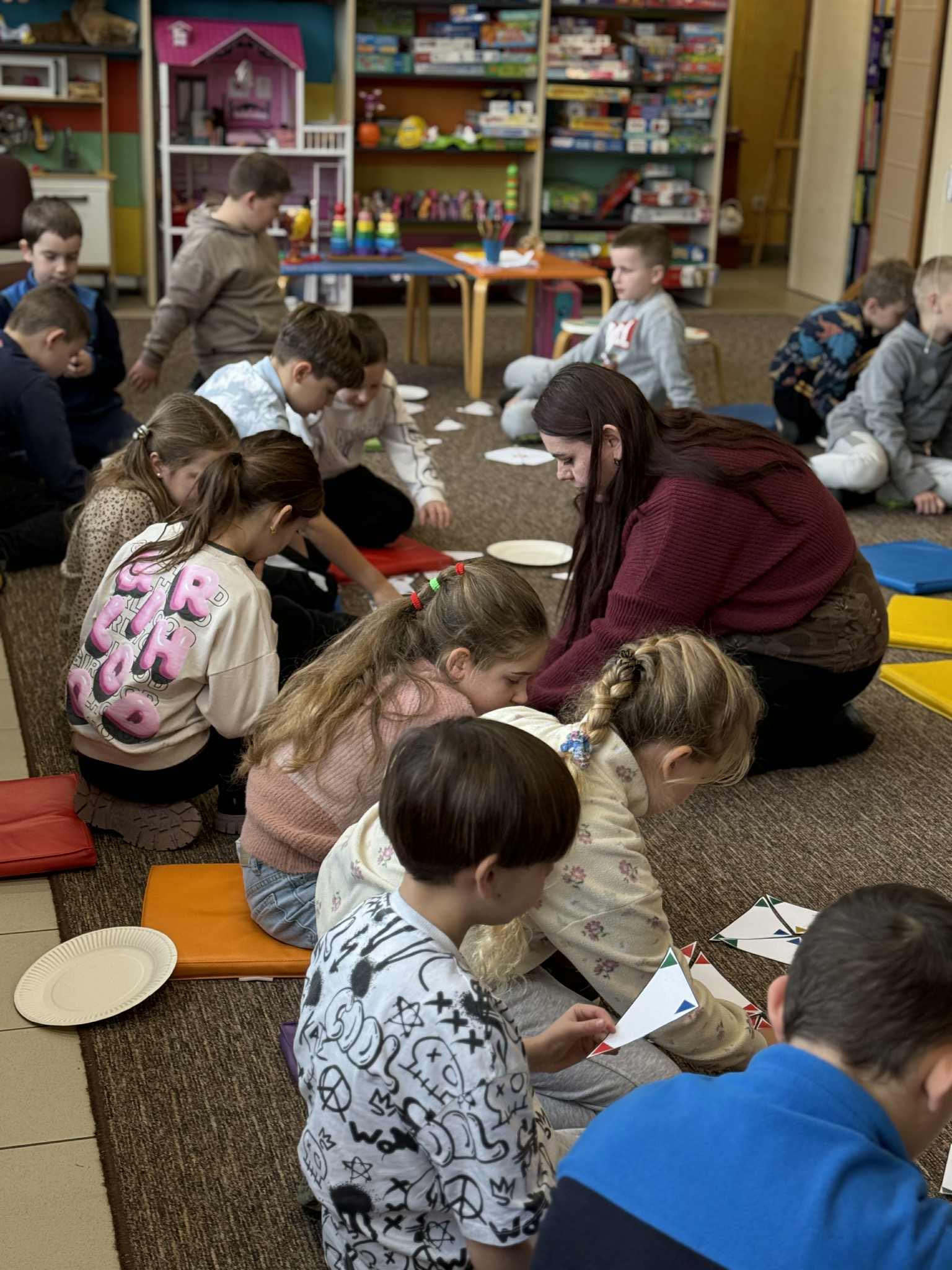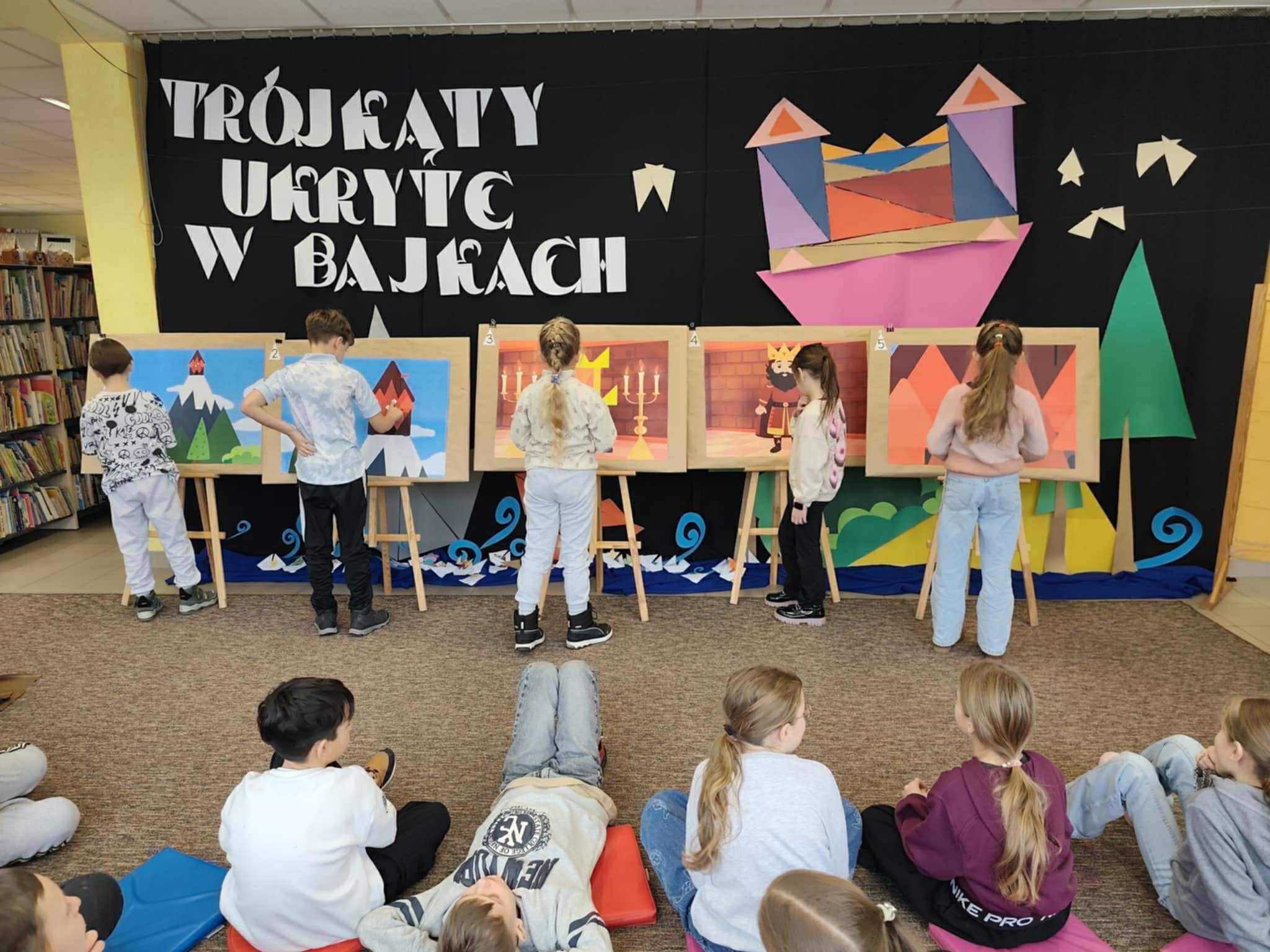 Udział uczniów klas 2b i 3a w zajęciach "Trójkąty ukryte w bajkach" w Bibliotece Publicznej w Dąbrowie Tarnowskiej