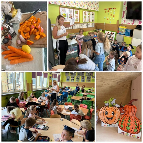 Uczniowie wspólnie przygotowali pyszną zupę dyniową, a następnie wykonali jesienne prace plastyczne